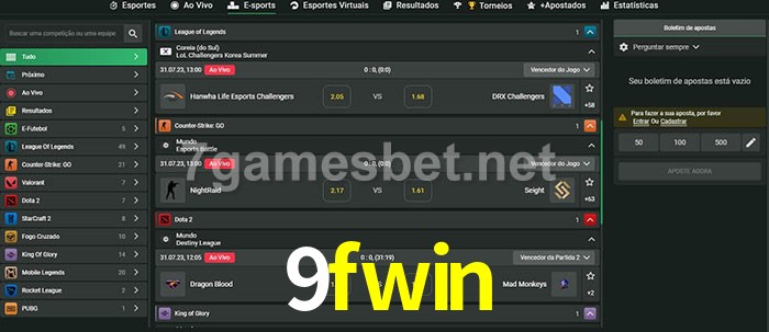 O 9fwin oferece uma grande seleção de opções de apostas em e-sports com probabilidades competitivas